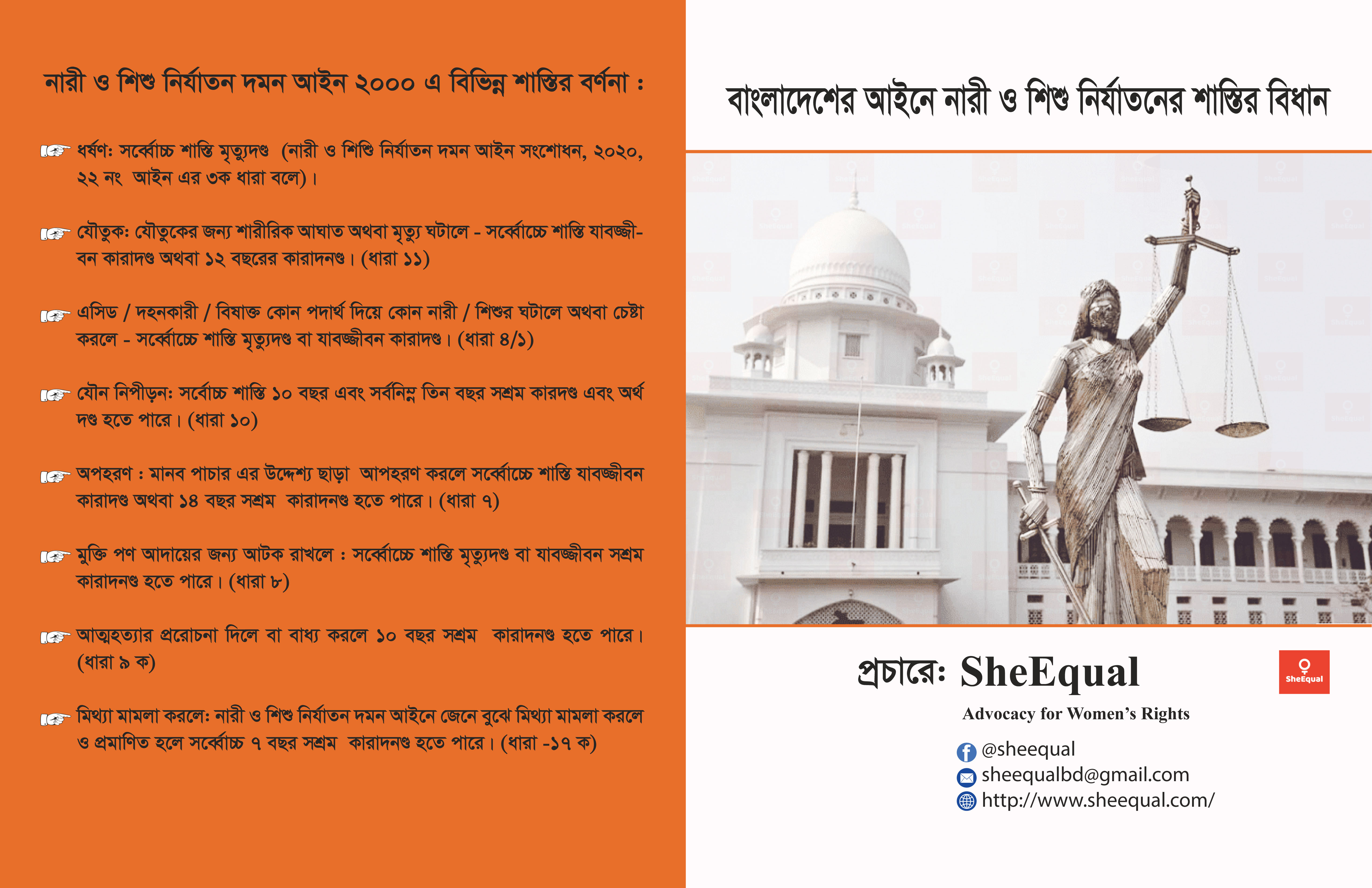 SheEqual is a Youth lead organization working to promote Women and Girls Rights in Bangladesh through different development activities, Storytelling, Research, Volunteering, Raising awareness, Campaign design, organizing capacity building training and workshops for the youth as well as the community people. We also circulate the women rights related laws, remarkable judgments and success stories within the community along with the digital spaces. We are very much committed to continue a promising advocacy for combating gender stereotypes and advancement of Women and Girls Rights in Bangladesh.